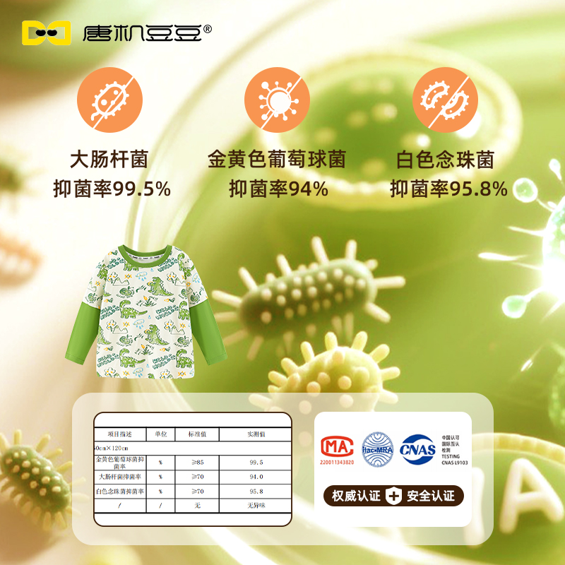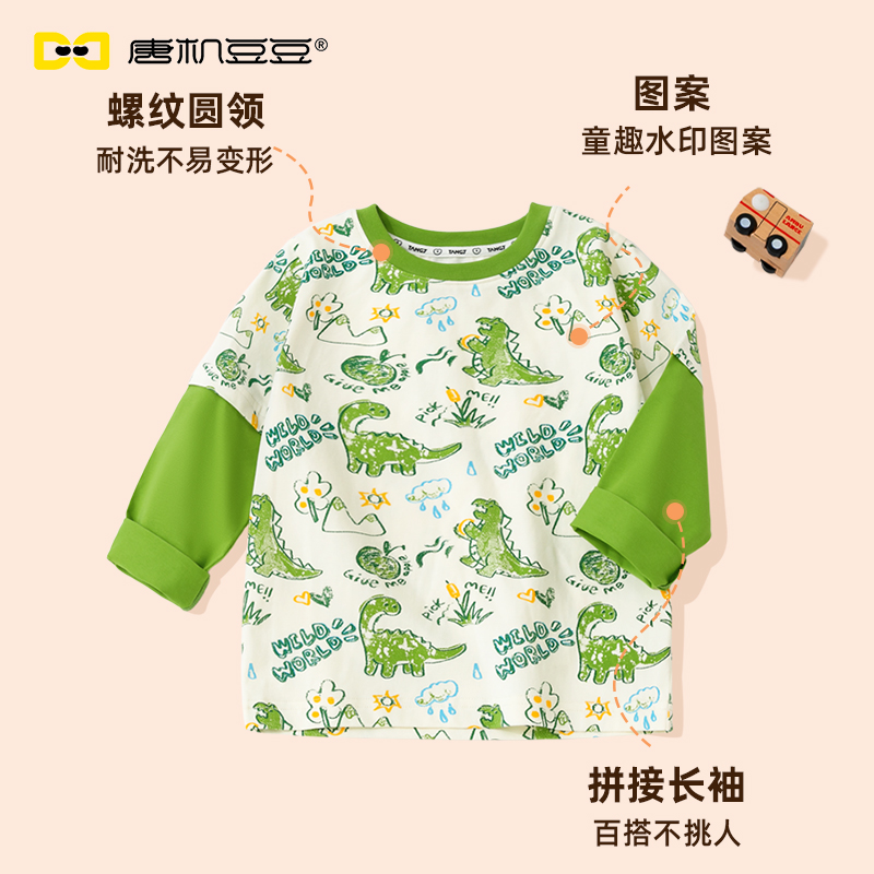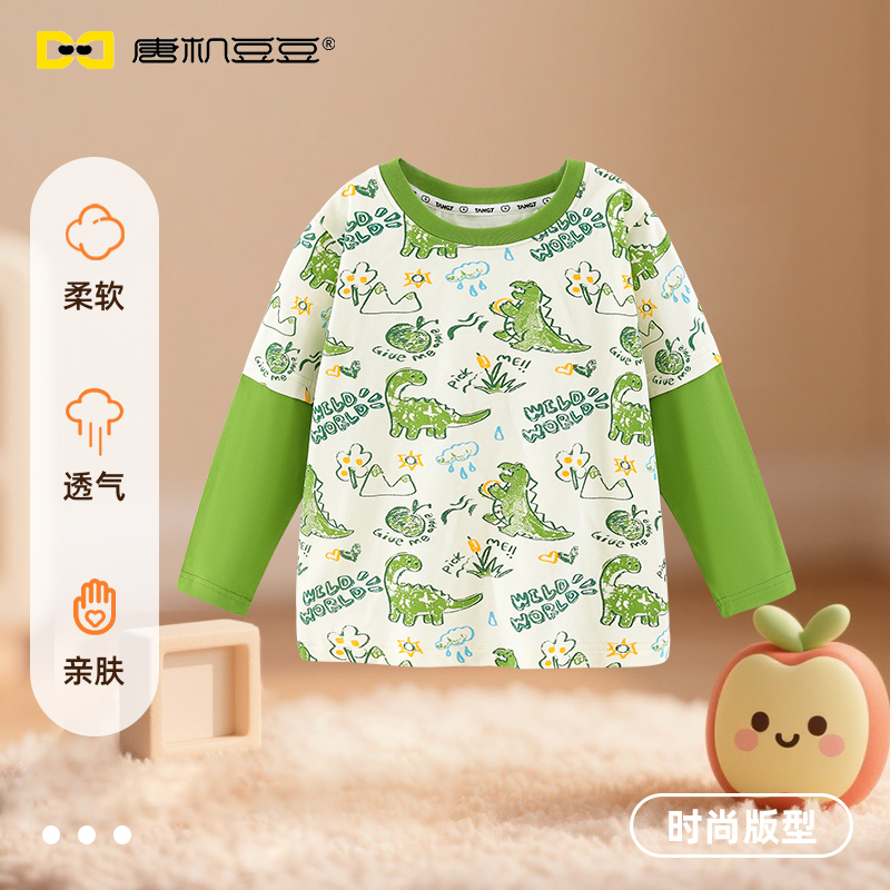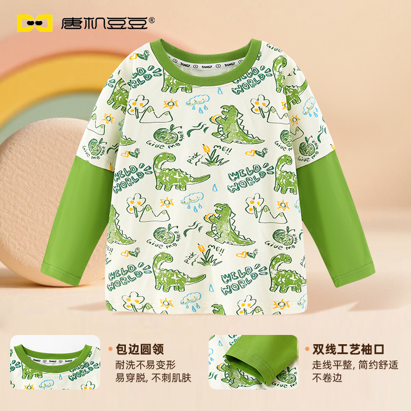 打底衫 男童假两件棉T恤7A抗菌卡通恐龙长袖 新款 唐机豆豆2025秋季