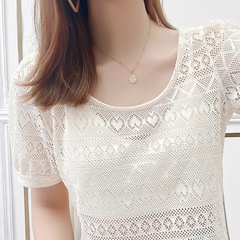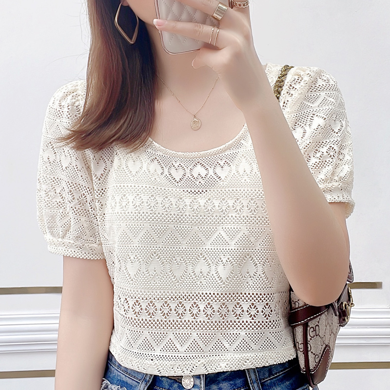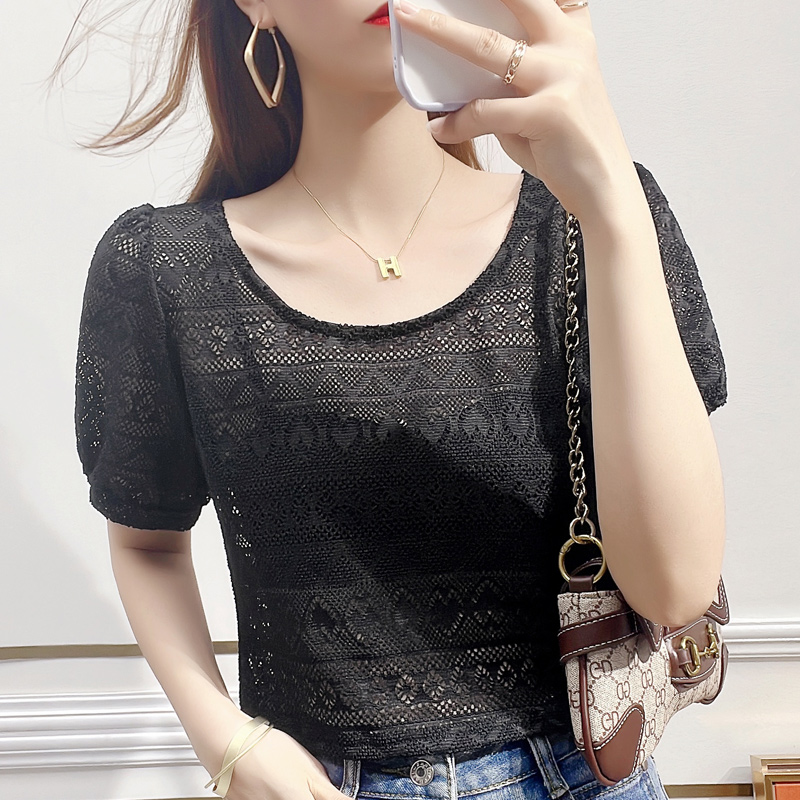 网纱t恤女吊带裙内搭短袖 法式 短款 蕾丝上衣女夏季 锁骨U领泡泡袖