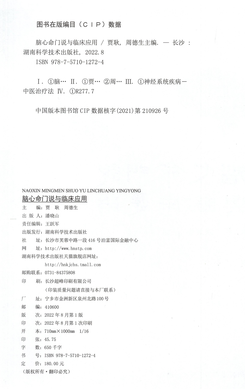 主编湖南科学技术出版 周德生 社9787571012724 贾耿 现货脑心命门说与临床应用