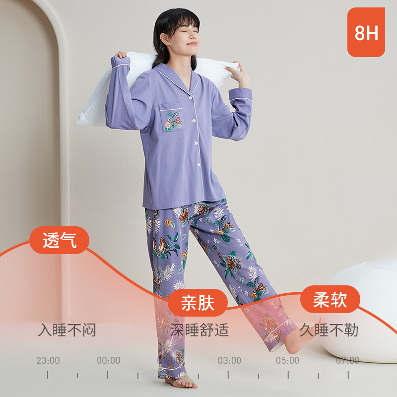 对襟休闲家居服春秋款 秋鹿秋季 套装 长裤 纯棉女士睡衣甜美印花长袖