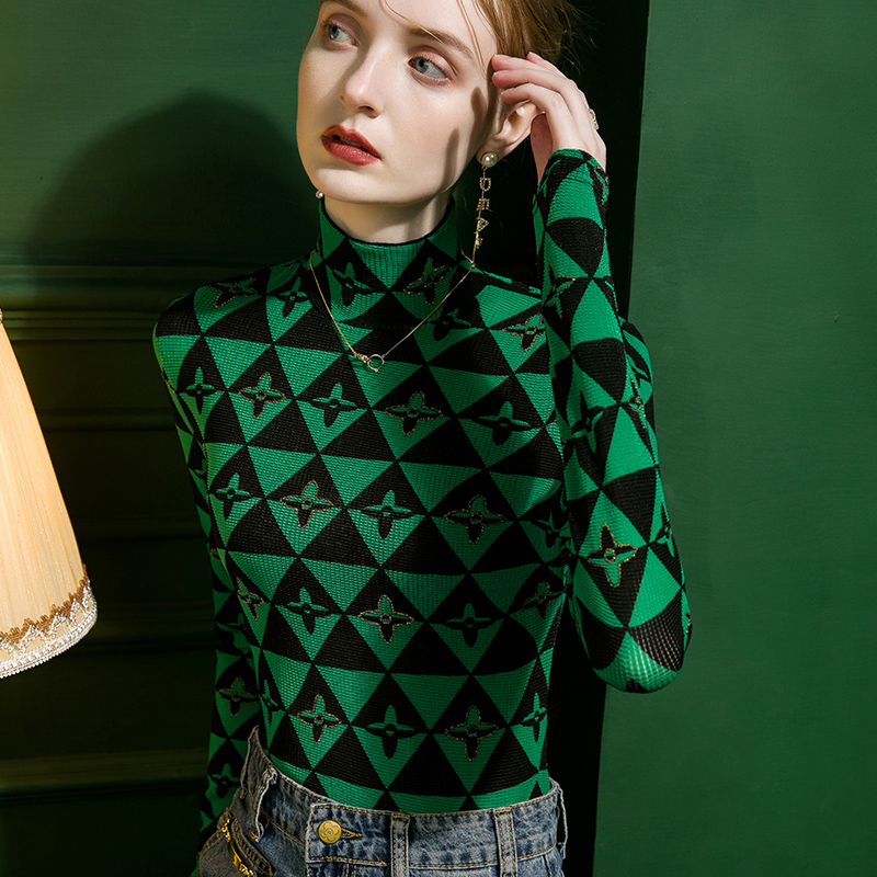 女修身 上衣小衫 2025秋季 洋气长袖 T恤女装 烫金印花立领蕾丝打底衫