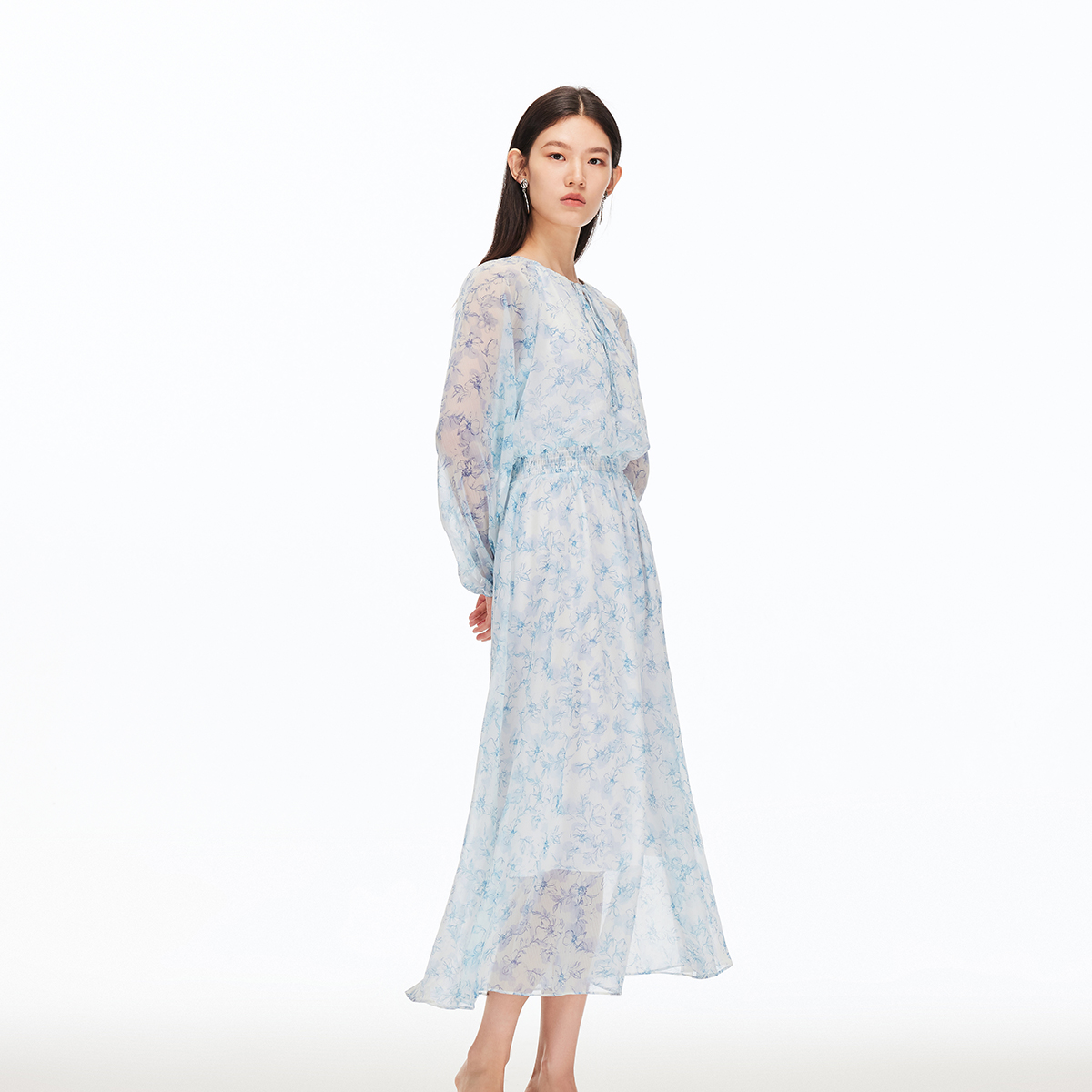 系带中长裙优雅 V领印花泡泡袖 Vero Moda奥莱连衣裙2025秋冬新款
