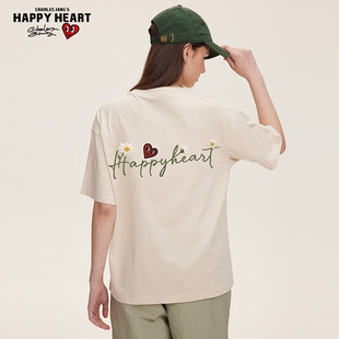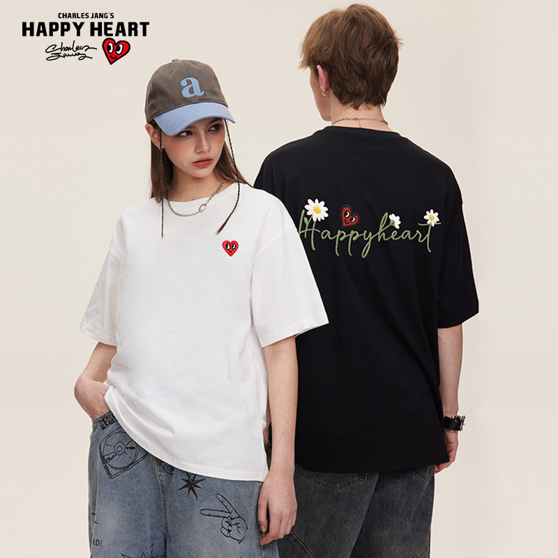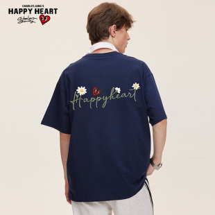 T恤男夏季 仿刺绣小雏菊字母印花圆领短袖 纯棉情侣 美式 查尔斯桃心