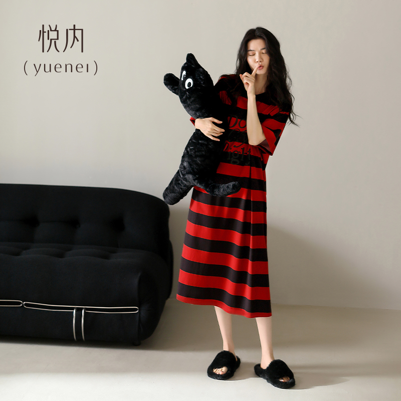 睡衣夏季 长款 夏天纯棉短袖 条纹红时尚 可外穿 宽松大码 悦内睡裙女款