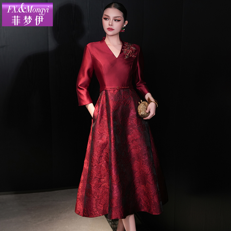 菲梦伊钉珠提花红色连衣裙女秋装 高端优雅气质收腰宴会敬酒服 新款