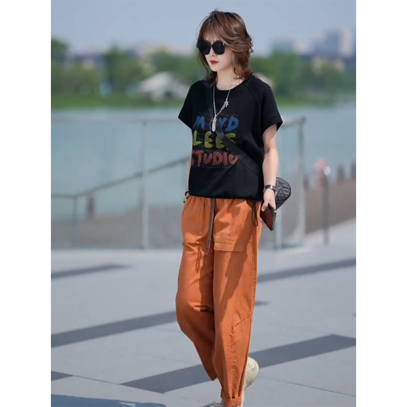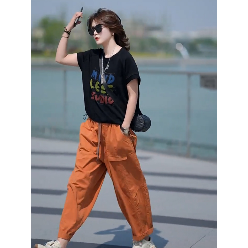 新款 2025休闲夏季 圆领印花宽松显瘦短袖 T恤 女 时尚 百搭哈伦裤 套装