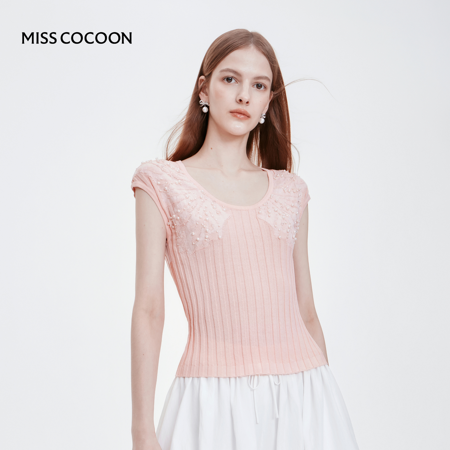 针织短袖 MISSCOCOON可可尼大领口粉色薄款 修身 新款 女 上衣2025夏季