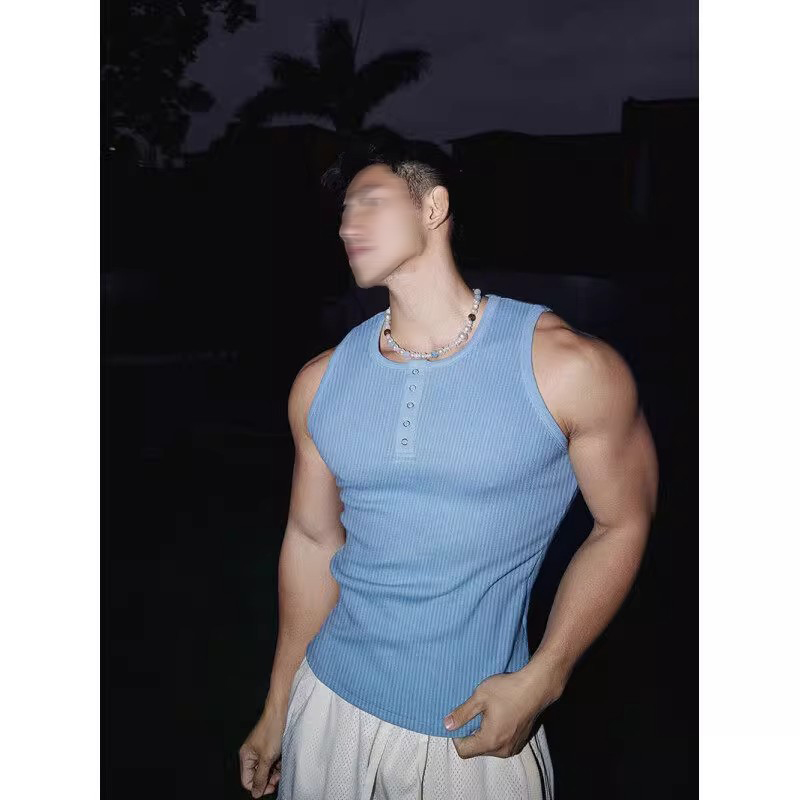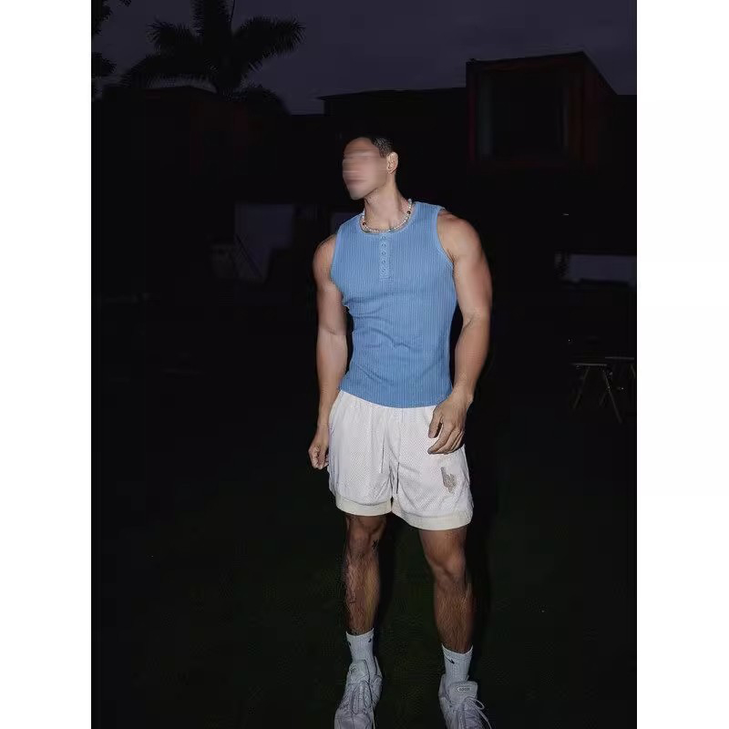 t恤美式 四面弹坑条肌理无袖 健身运动坎肩 修身 灰色亨利领背心男款