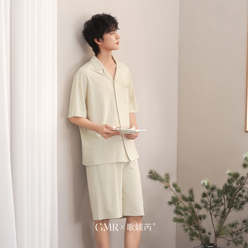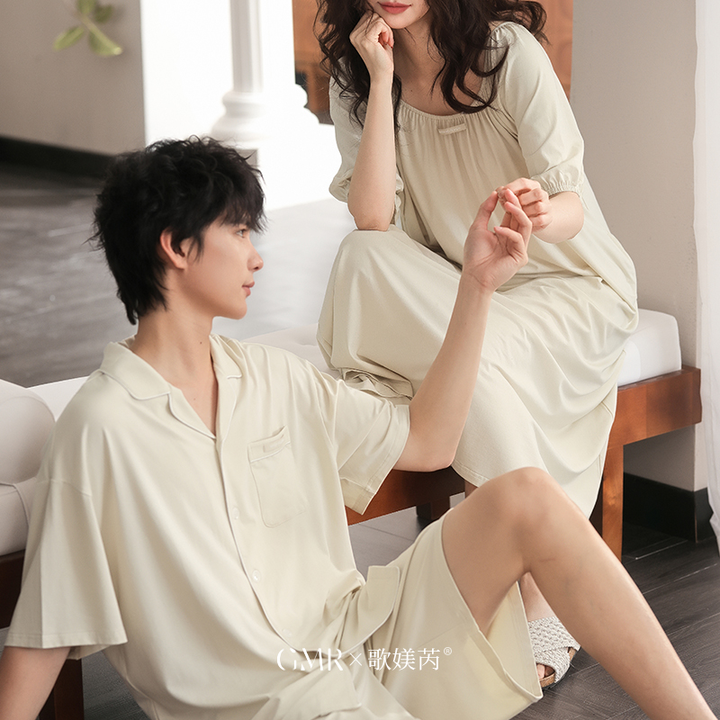 加大码 情侣夏季 翻领短裤 裙纯色男士 家居服 凉感莫代尔棉睡衣女短袖