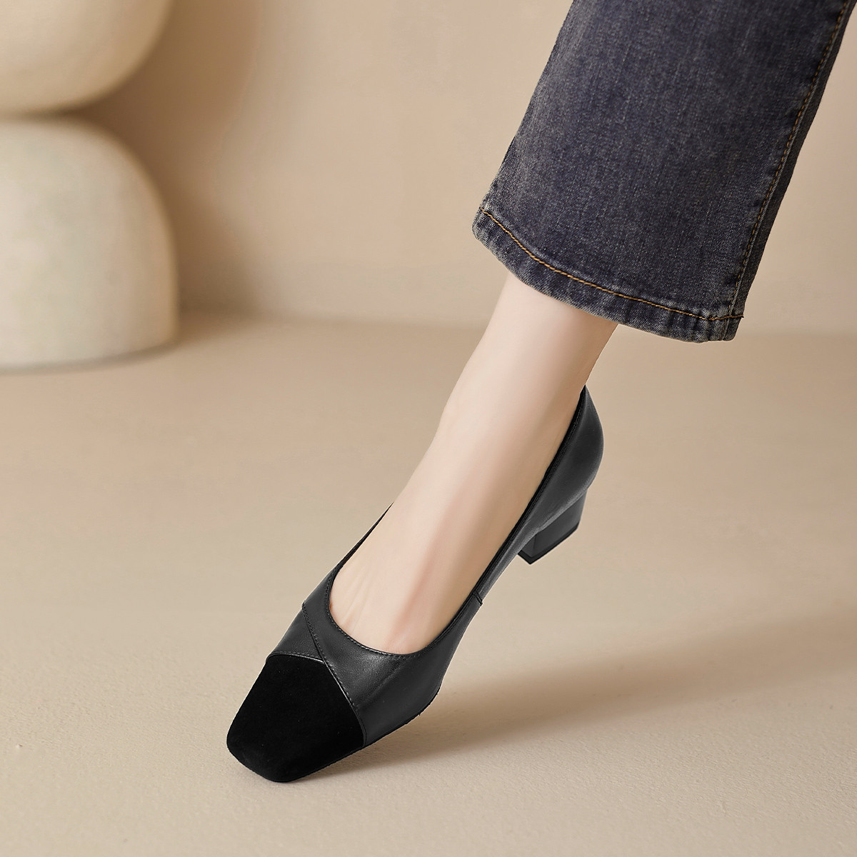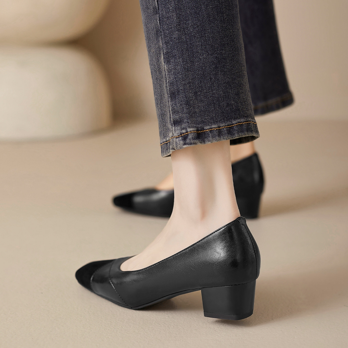 新款 鞋 拼接浅口单鞋 复古风时装 女粗跟不累脚通勤鞋 星期六2025春季