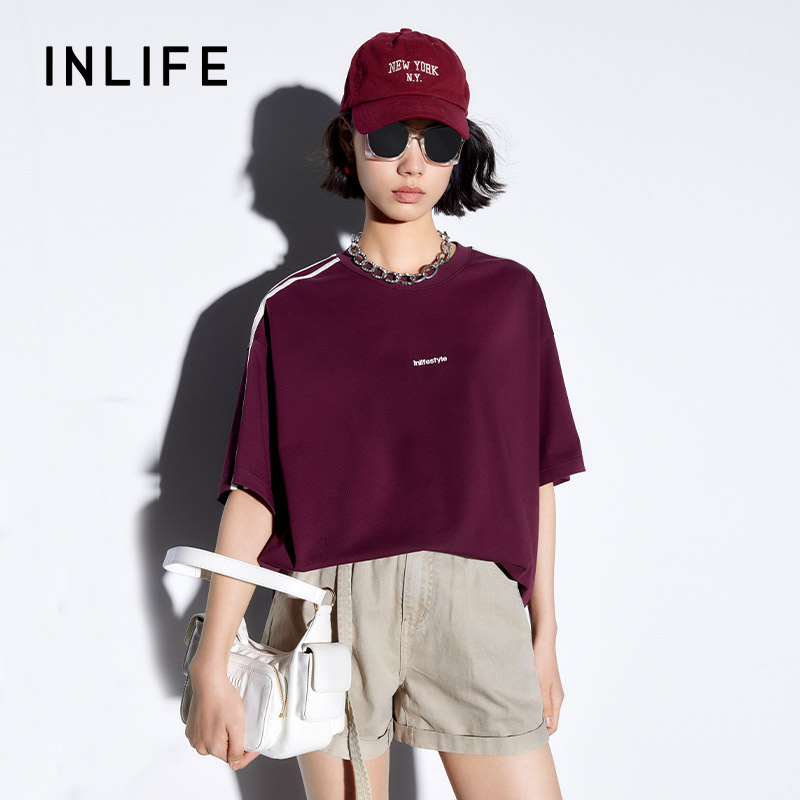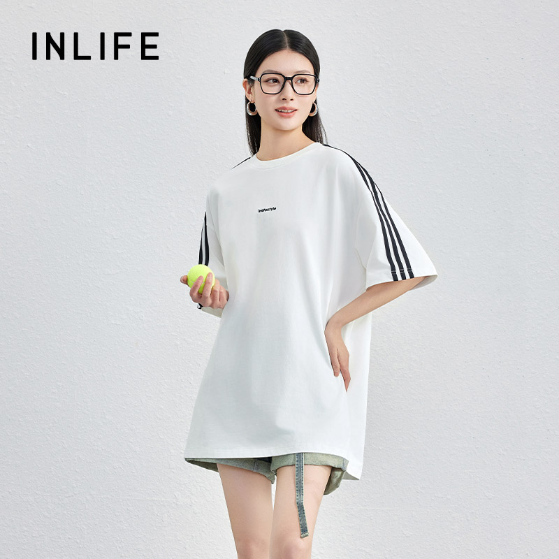 宽松慵懒休闲上衣 T恤女2025夏新款 伊纳芙美式 圆领三条杠字母短袖