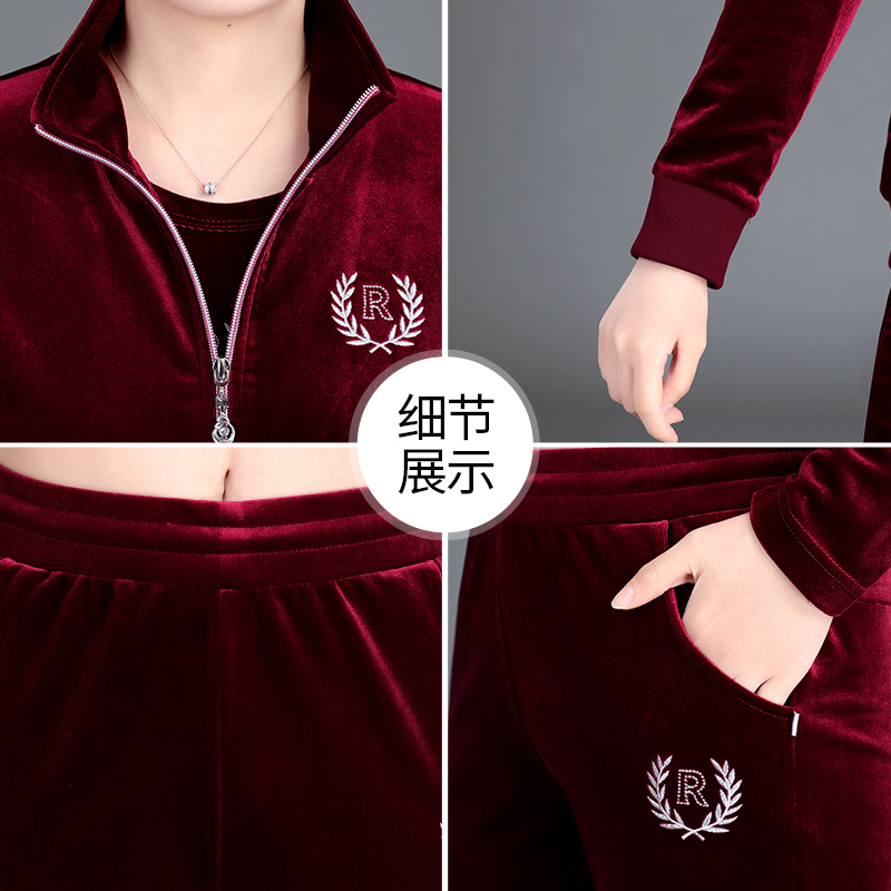 中年妈妈宽松大码 春秋装 运动装 女中老年女装 洋气三件套 金丝绒套装