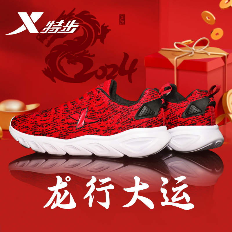 秋季 休闲鞋 飞织透气本命年红色运动鞋 男士 减震网面跑步鞋 特步男鞋