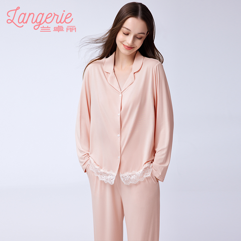 红豆柔柔棉睡衣女春秋长袖 带胸垫可外穿柔软优可丝磨毛家居服套装