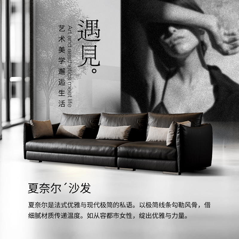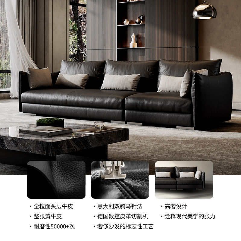 广巢 极简真皮客厅三人位直排皮艺黑色复古大平层B 夏奈尔沙发意式
