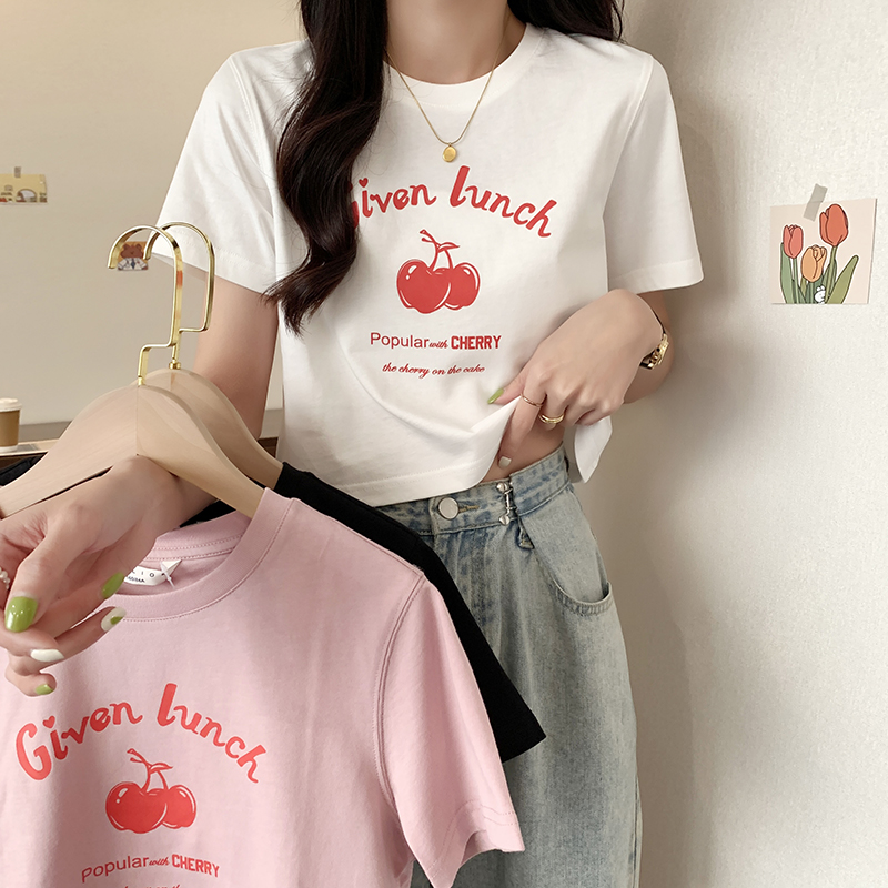 辣妹宽松短款 樱桃印花紧身小衫 上衣洋气 T恤女春秋季 唐狮短袖