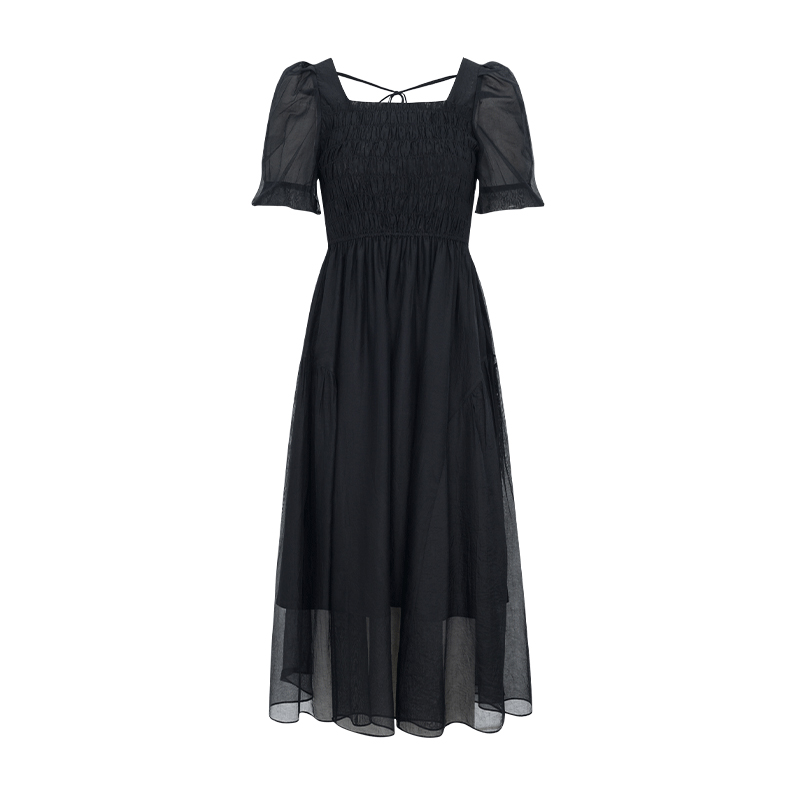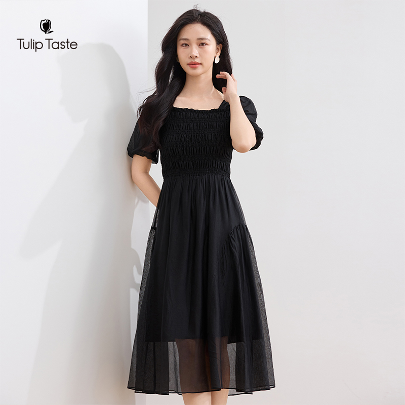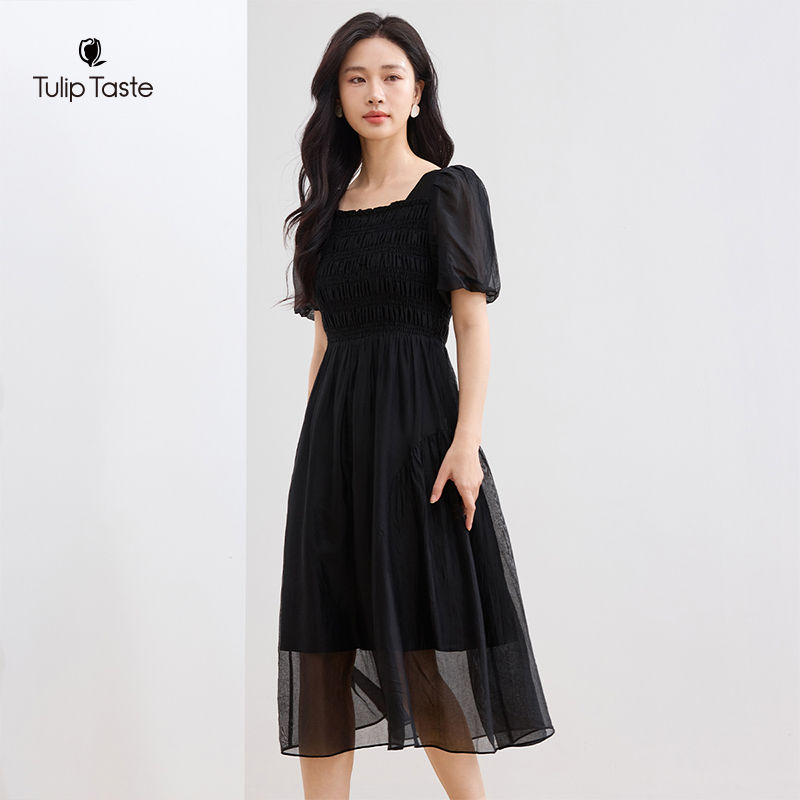 显瘦打揽收腰A字裙 泡泡袖 郁香菲方领连衣裙女气质通勤夏季 时尚