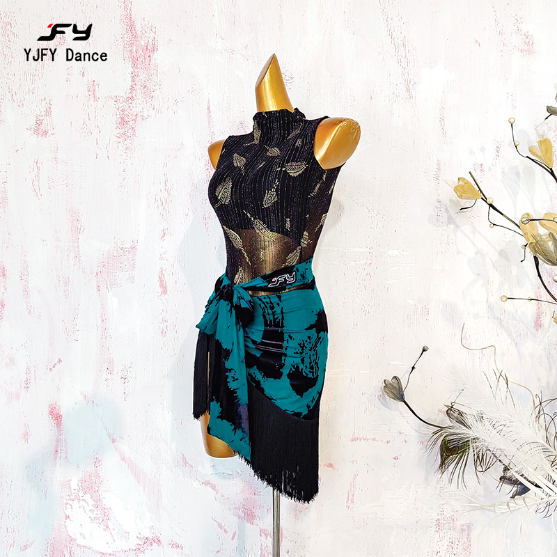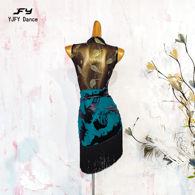 又见梵羽拉丁舞服网纱透视连体衣水墨烧花流苏裙国标练功服21