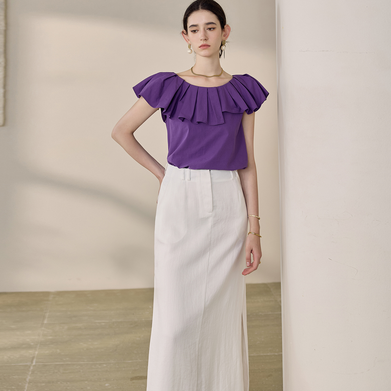 女长袖 衬衫 18345220 佐丹奴褶皱肌理拼接蕾丝圆领宽松法式 设计师款