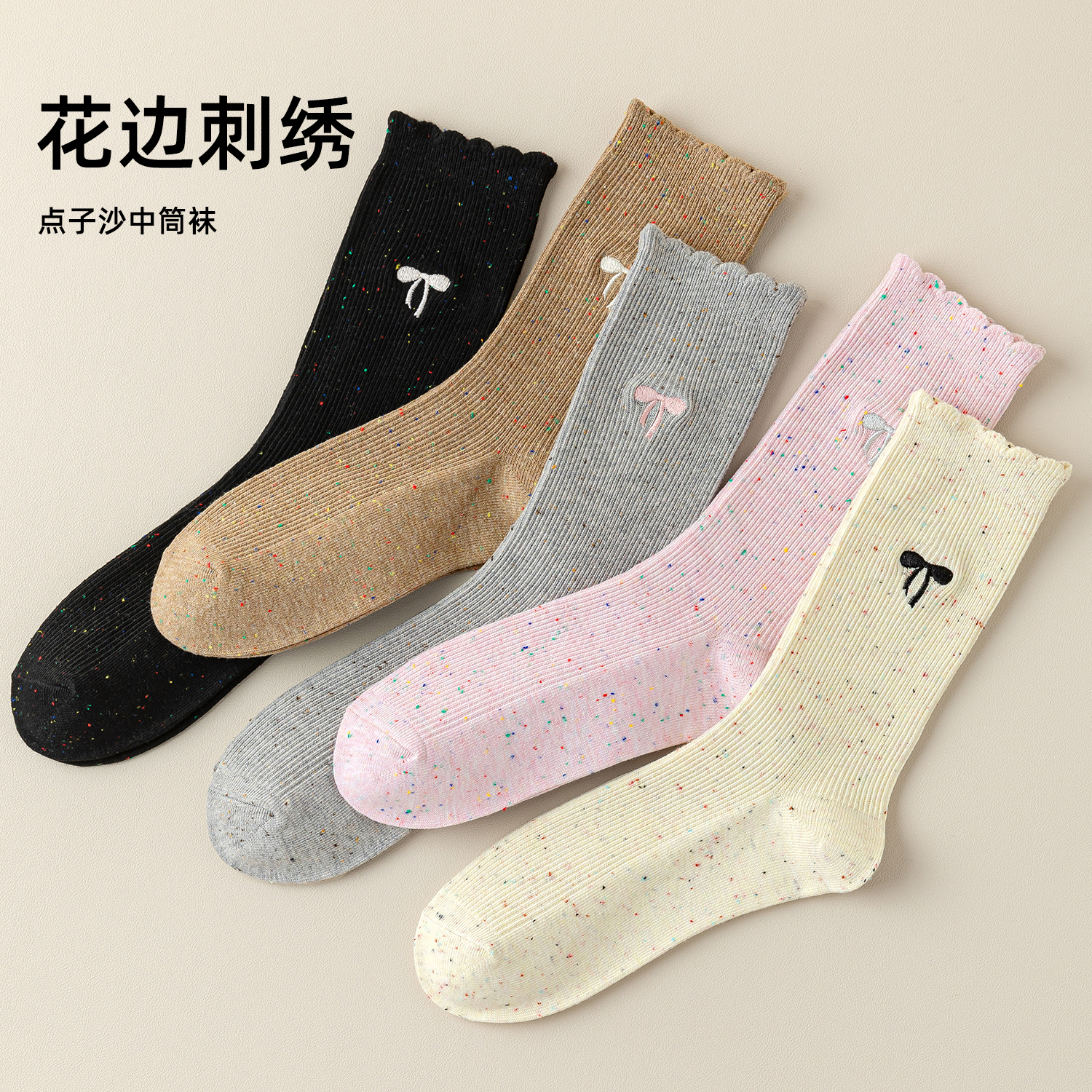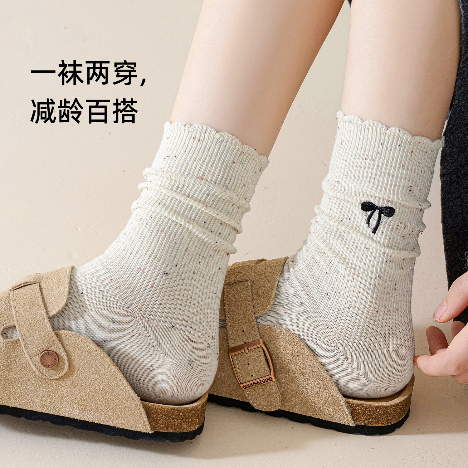 纯棉长袜 夏季 花边袜子女春秋款 中筒双针蝴蝶结甜美芭蕾风搭勃肯鞋