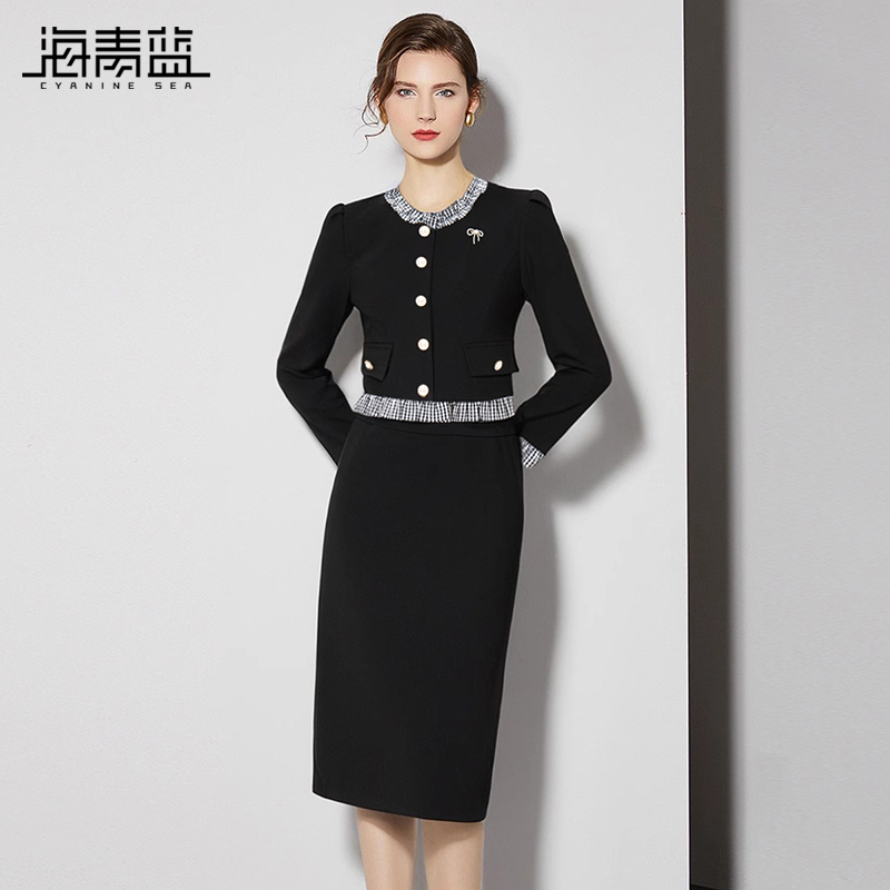 气质优雅通勤长袖 海青蓝法式 新款 裙女2025秋季 两件套 轻熟风套装