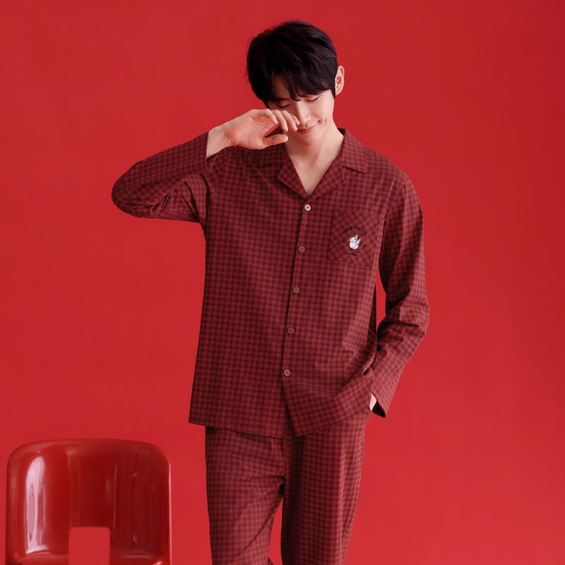 格子秋冬季 芬腾大红色睡衣男士 加大码 纯棉长袖 家居服 本命年春秋款