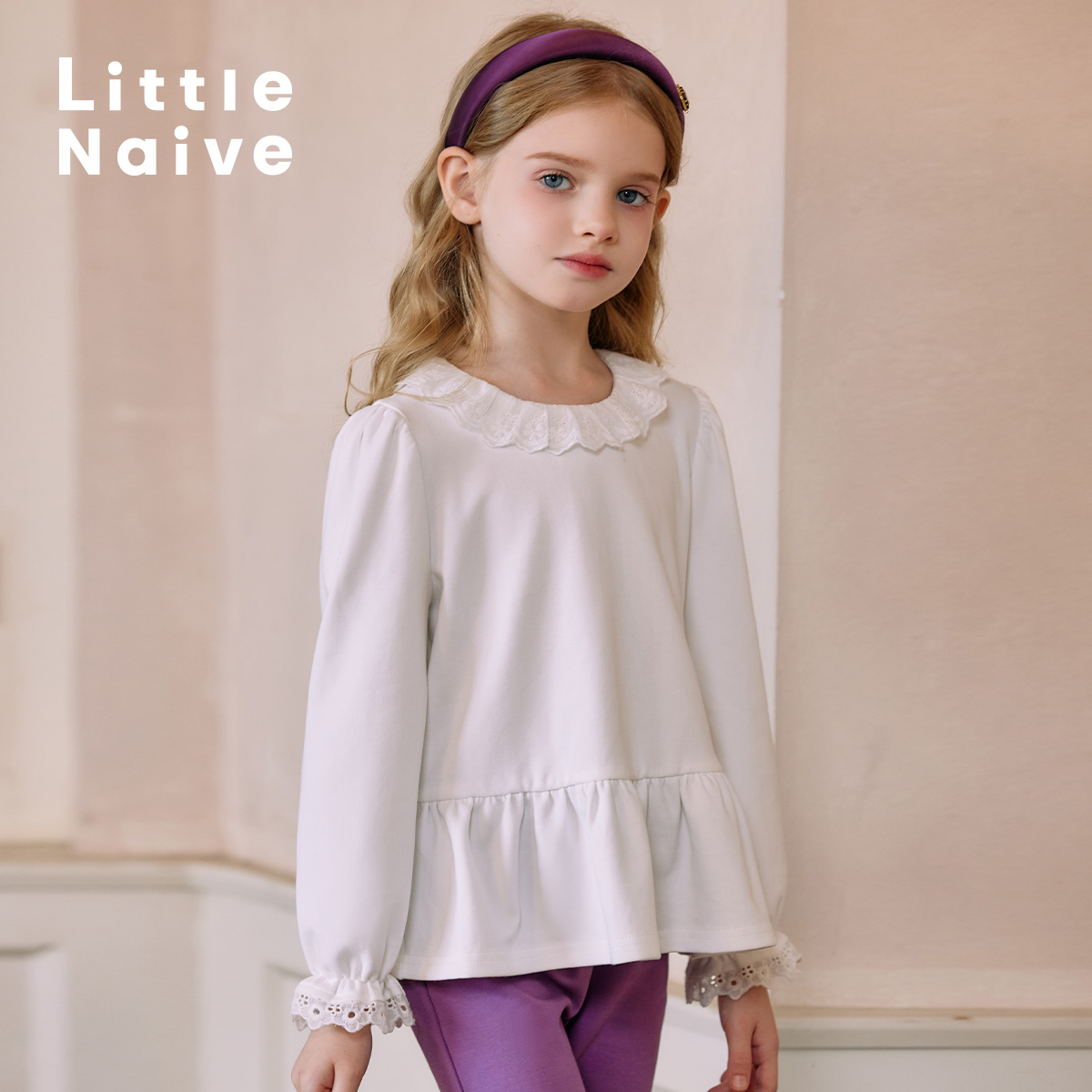 上衣 花边领短袖 LittleNaive 女童春秋t恤宽松内搭白色T恤儿童法式