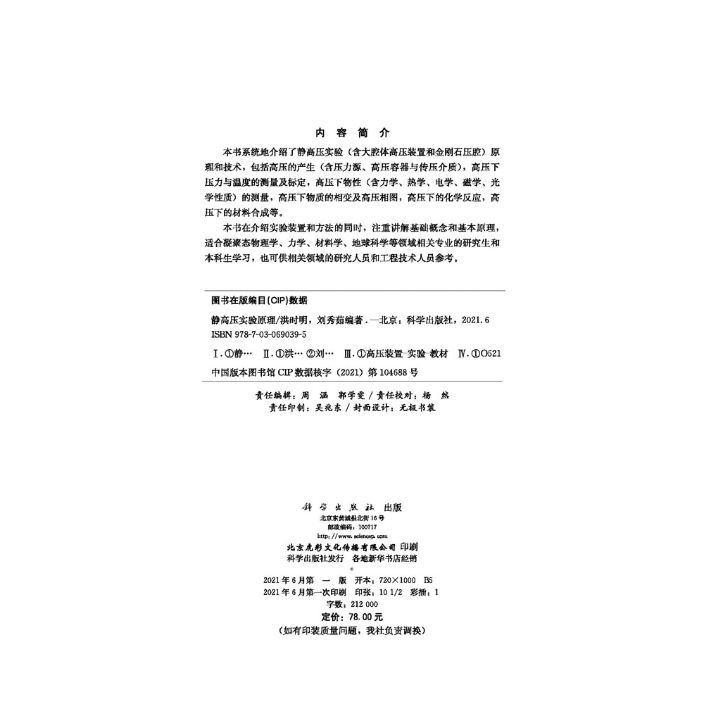 社 刘秀茹科学出版 静高压实验原理 洪时明