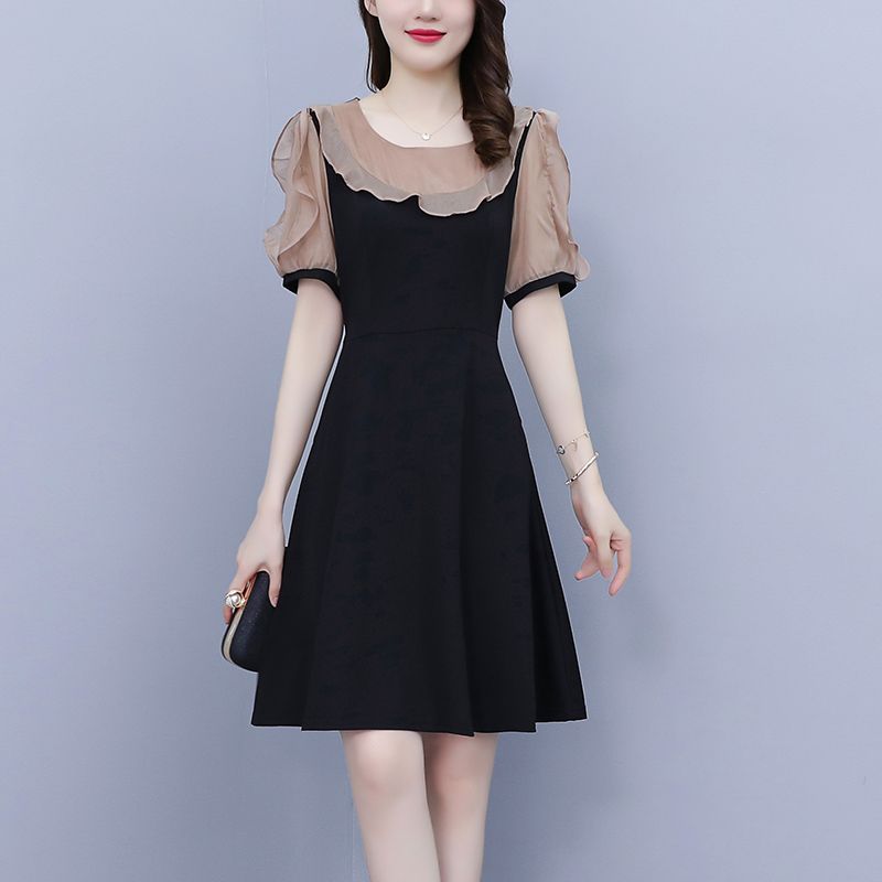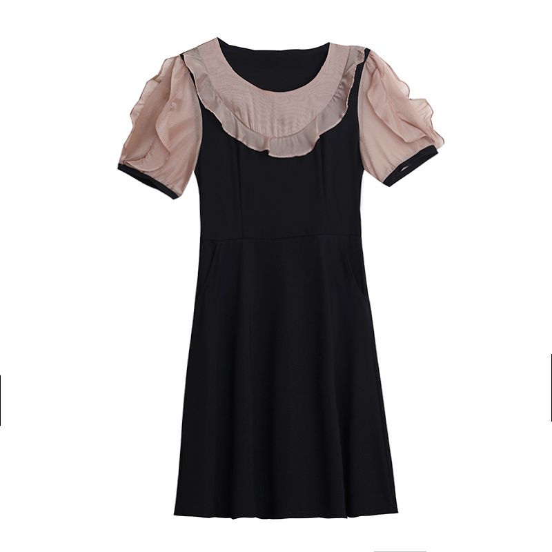 女时尚 大码 显瘦连衣裙 雪纺荷叶边拼接减龄小黑裙夏新款 胖妹妹韩版