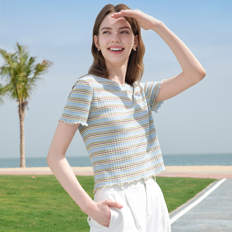 圆领小衫 新款 上衣 2025年夏季 betu百图木耳边彩色条纹T恤女短袖