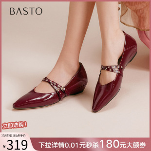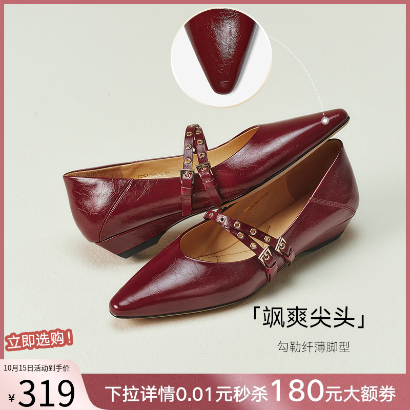 尖头低跟红色浅口女单鞋 百思图2025秋季 法式 玛丽珍鞋 A3191CQ5 新款