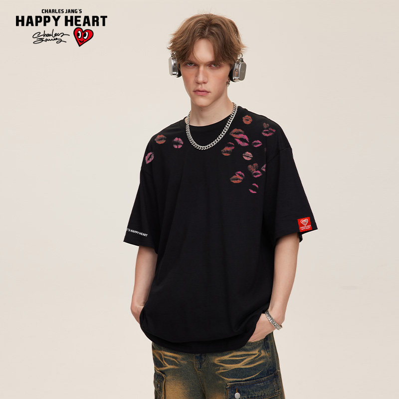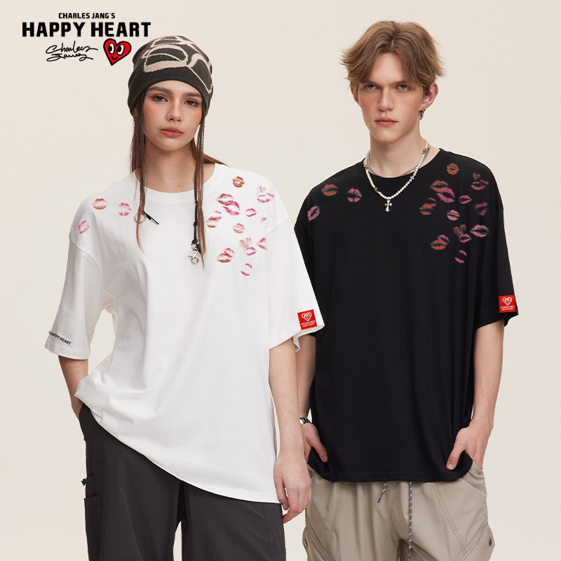休闲百搭男女同款 查尔斯桃心 圆领夏季 t恤印花唇印美式 纯棉短袖