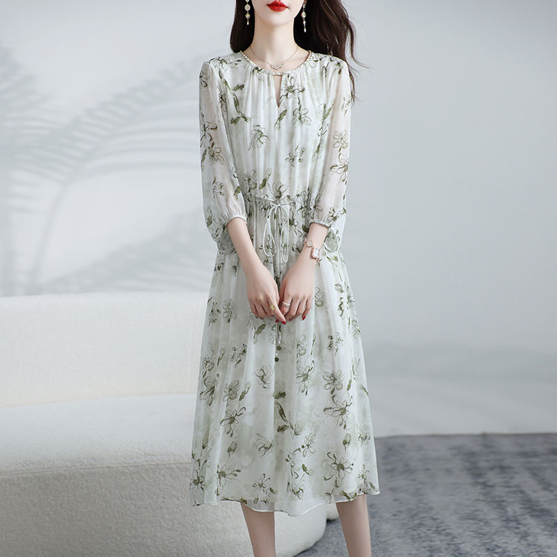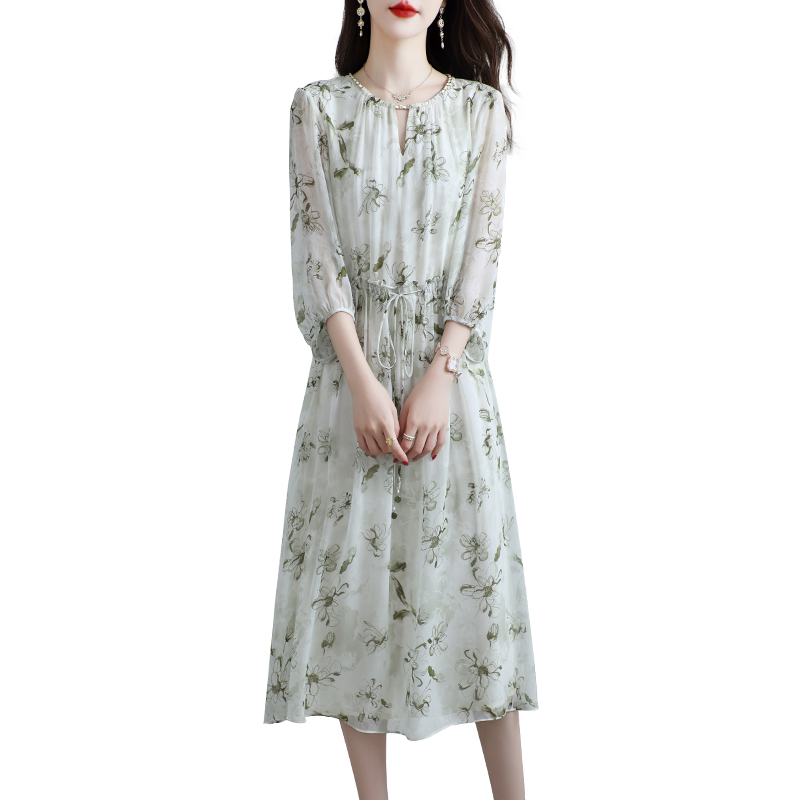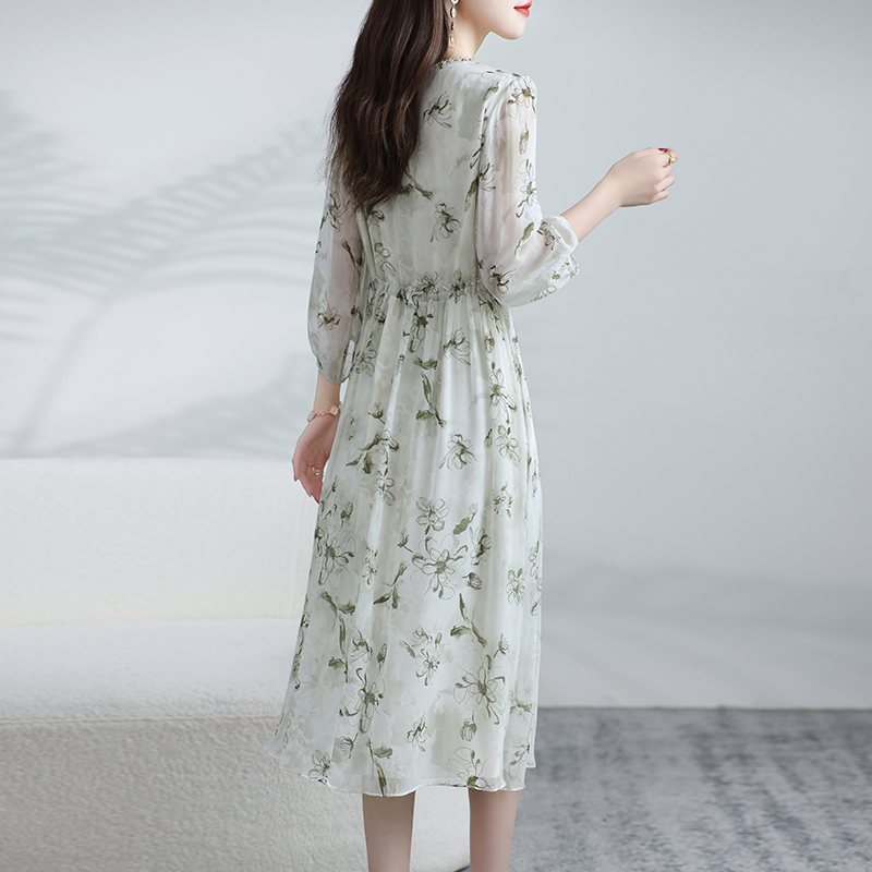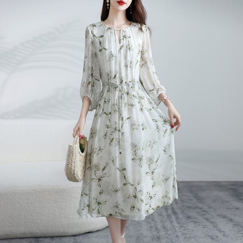 新款 优雅裙子 真丝连衣裙女印花精致甜美清新温柔桑蚕丝收腰灯笼袖
