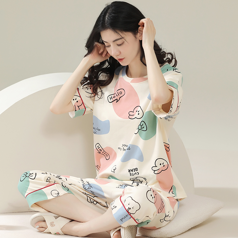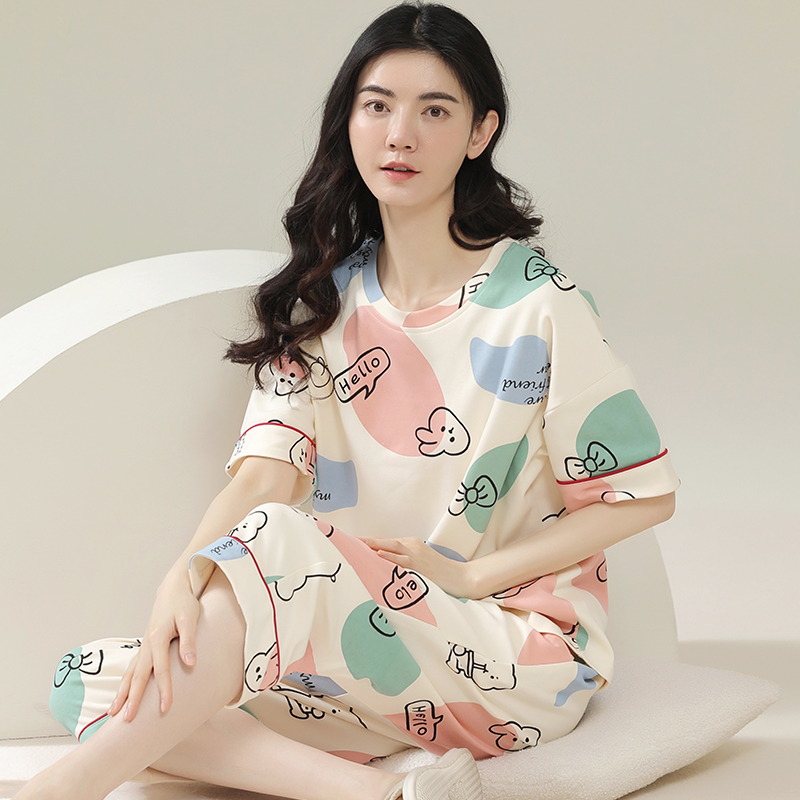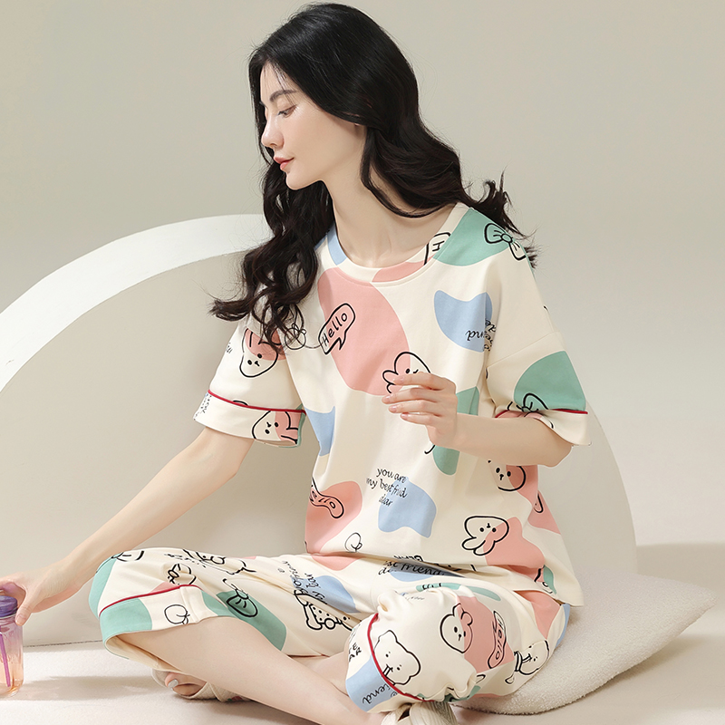 七分裤 短袖 大码 夏天女款 芬腾睡衣女士夏季 甜美家居服套装 纯棉薄款