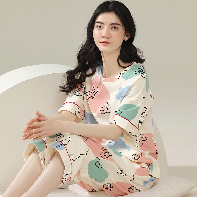 夏季 外穿女款 薄款 宽松休闲大码 家居服 透气套装 芬腾睡衣女纯棉短袖