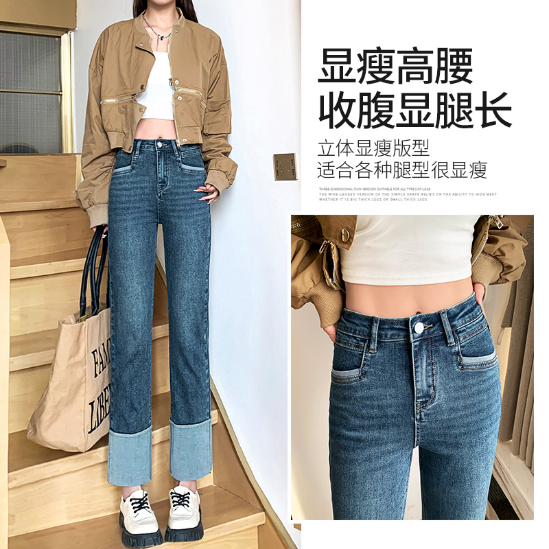 加绒复古高腰小个子直筒长裤 新款 子 女秋冬大码 遮肉封神阔腿牛仔裤