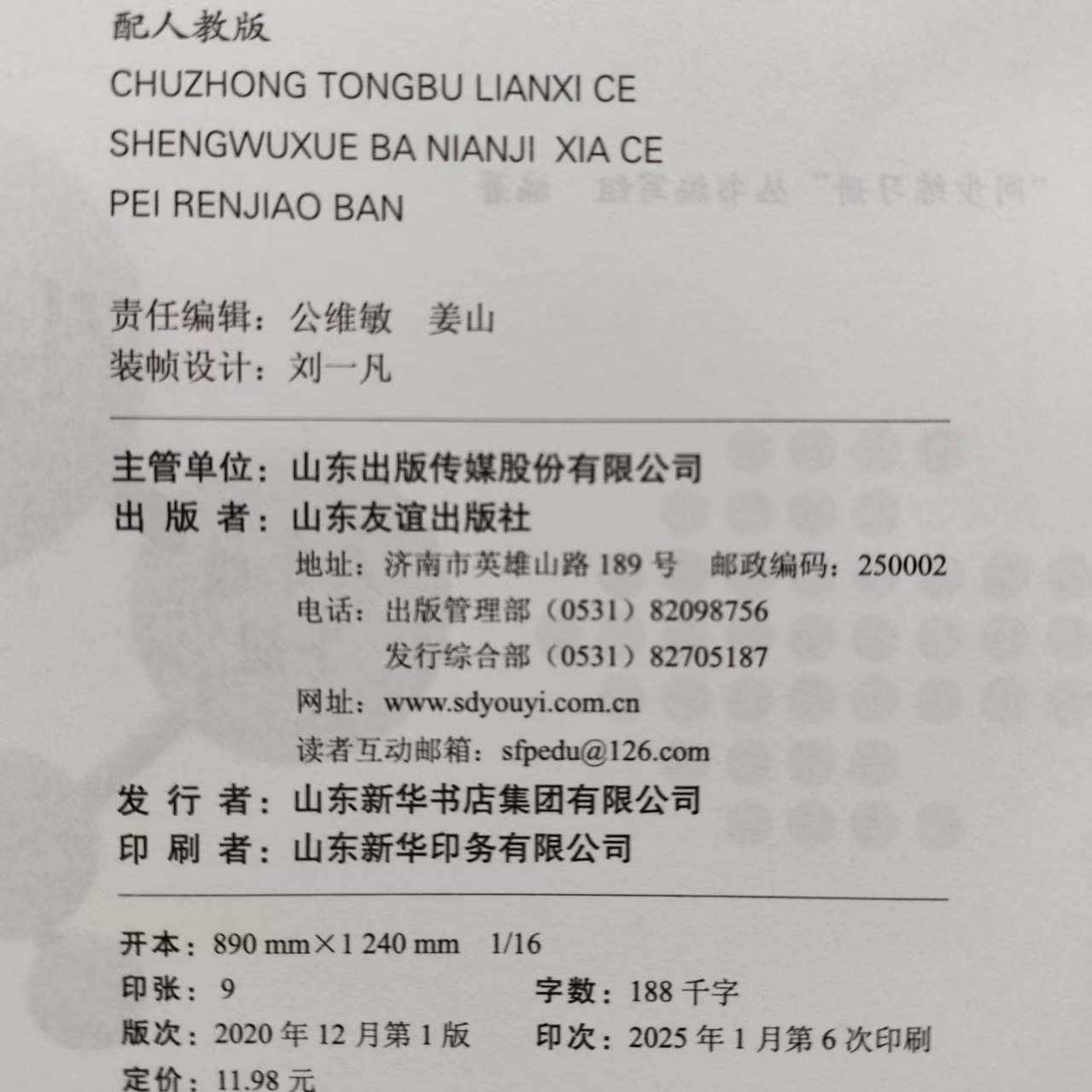2025春配人教版 社初中八年级生物学下册同步配套练习册初二8年级生物下学期同步练习 初中同步练习册生物学八年级下册山东友谊出版