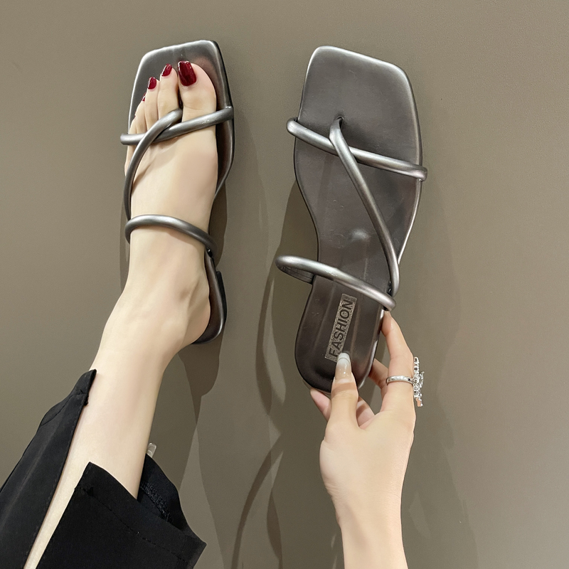 网红仙女风低跟平底凉鞋 夏天夹趾 女露趾一字扣交叉绑带罗马沙滩鞋