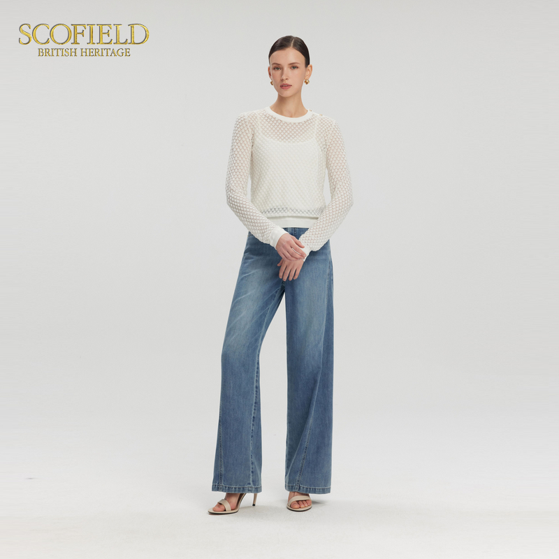 纯棉洗水破骨高腰阔腿九分牛仔裤 子女装 18415915 佐丹奴裤 设计师款