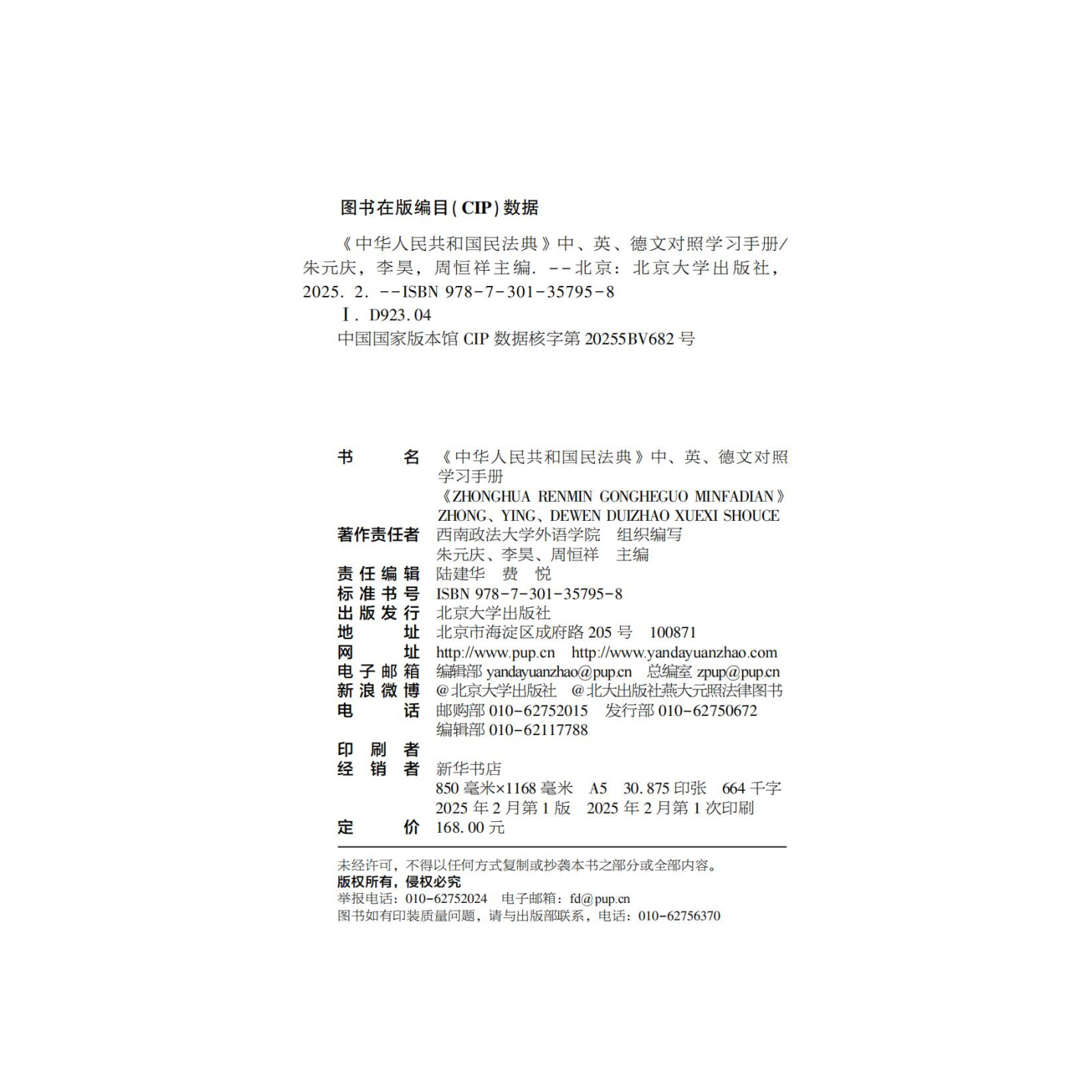 德文对照学习手册 朱元 社 中 9787301357958 周恒祥北京大学出版 英 李昊 中华人民共和国民法典 庆