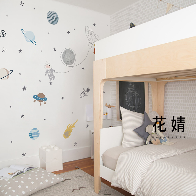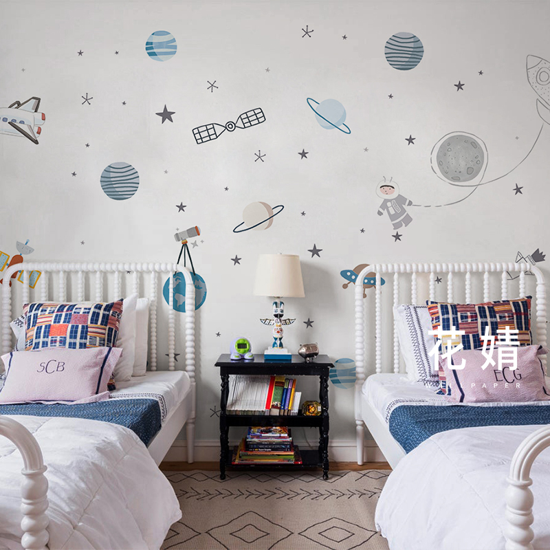 手绘星球宇航员壁纸北欧男孩卧室床头背景墙纸壁画儿童房满屋墙布