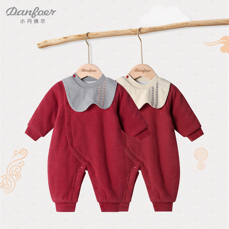 婴儿夹棉连体衣秋冬季 保暖宝宝满月服红色喜庆新生儿拜年服圣诞节
