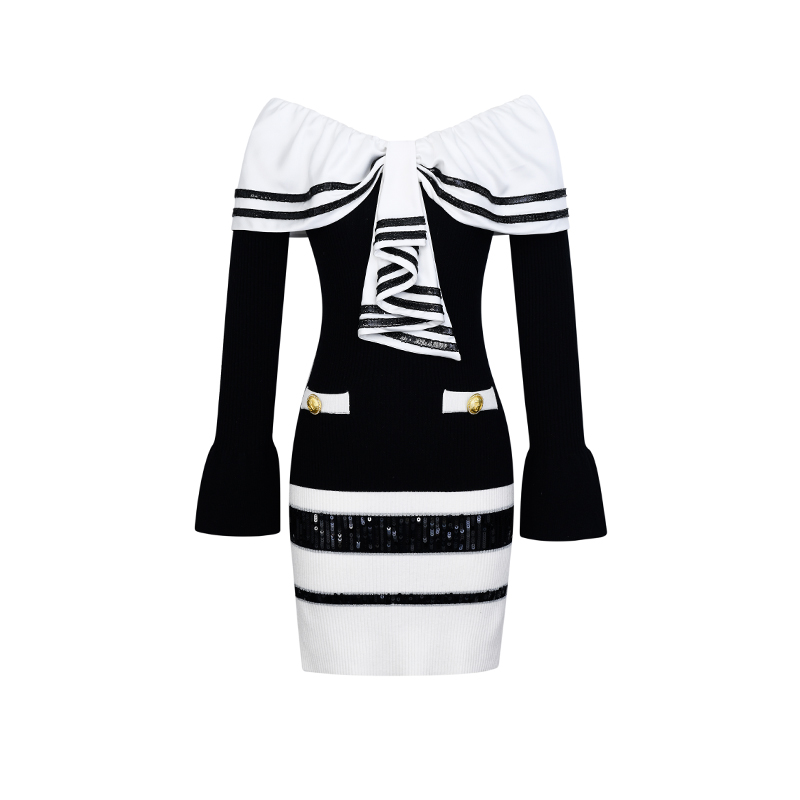 lefame拉飞姆一字领蝴蝶结收身针织连衣裙