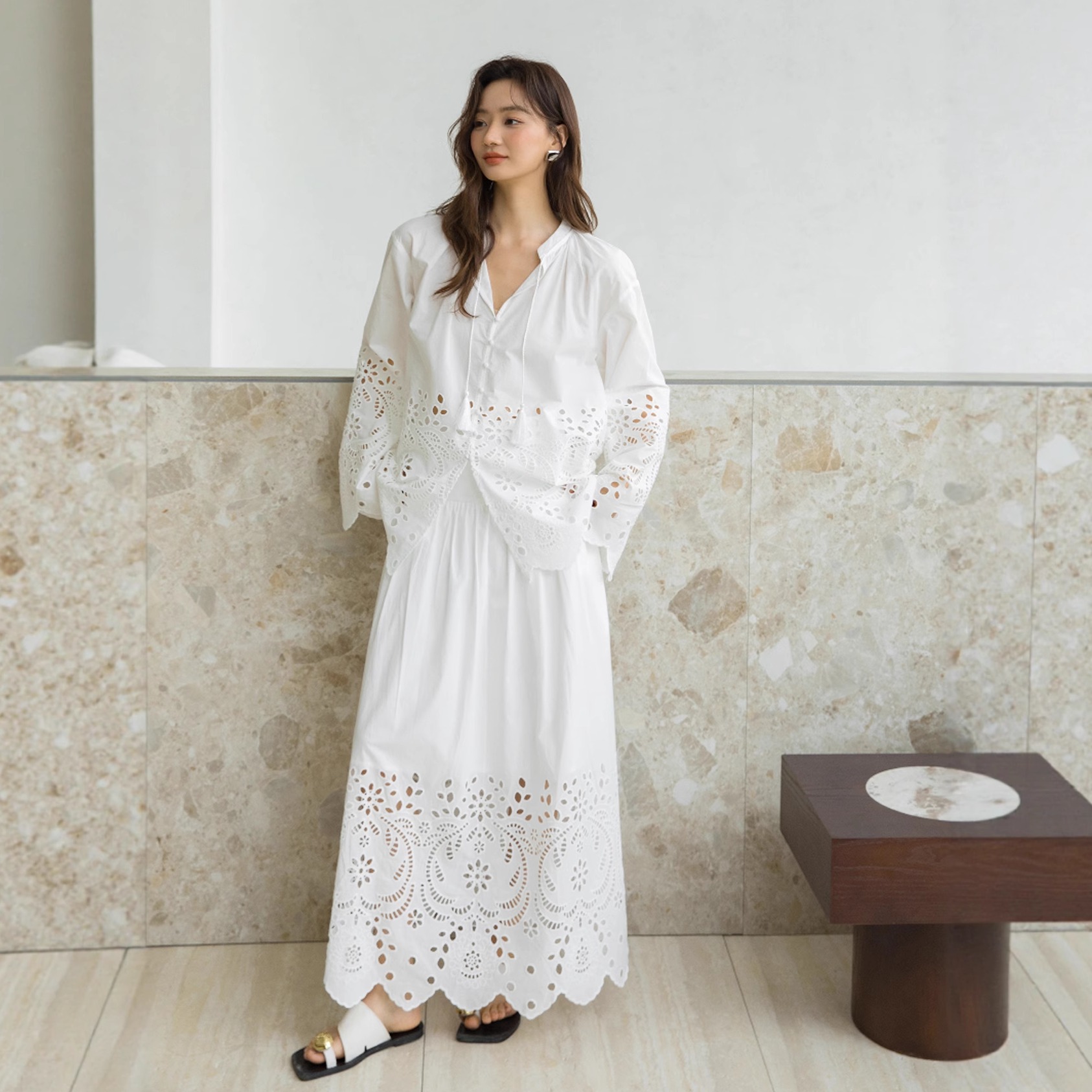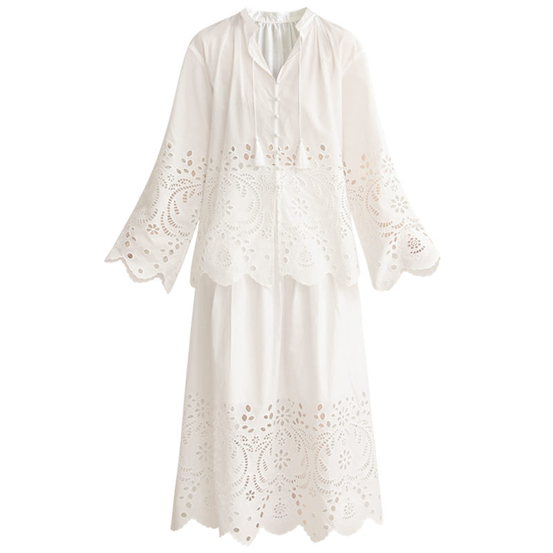 白色系流苏镂空绣花上衣100%棉度假风长袖 宽松衬衣大摆半裙8643