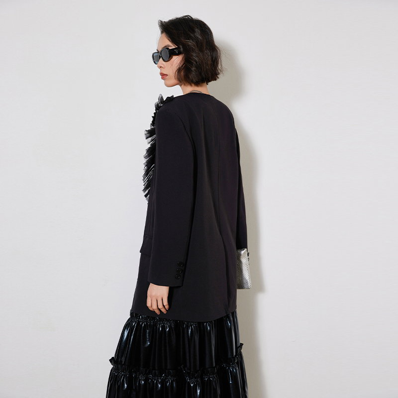 白鹿语极简职场风冷淡系西装 拼接花边网纱翻领西服外套女 2025春季