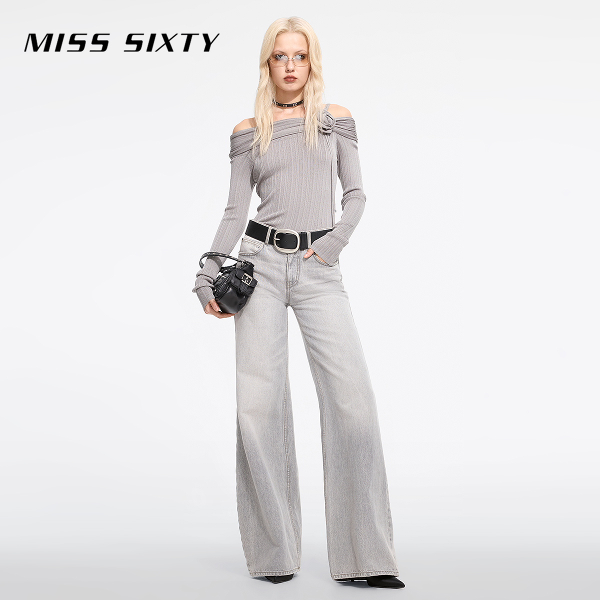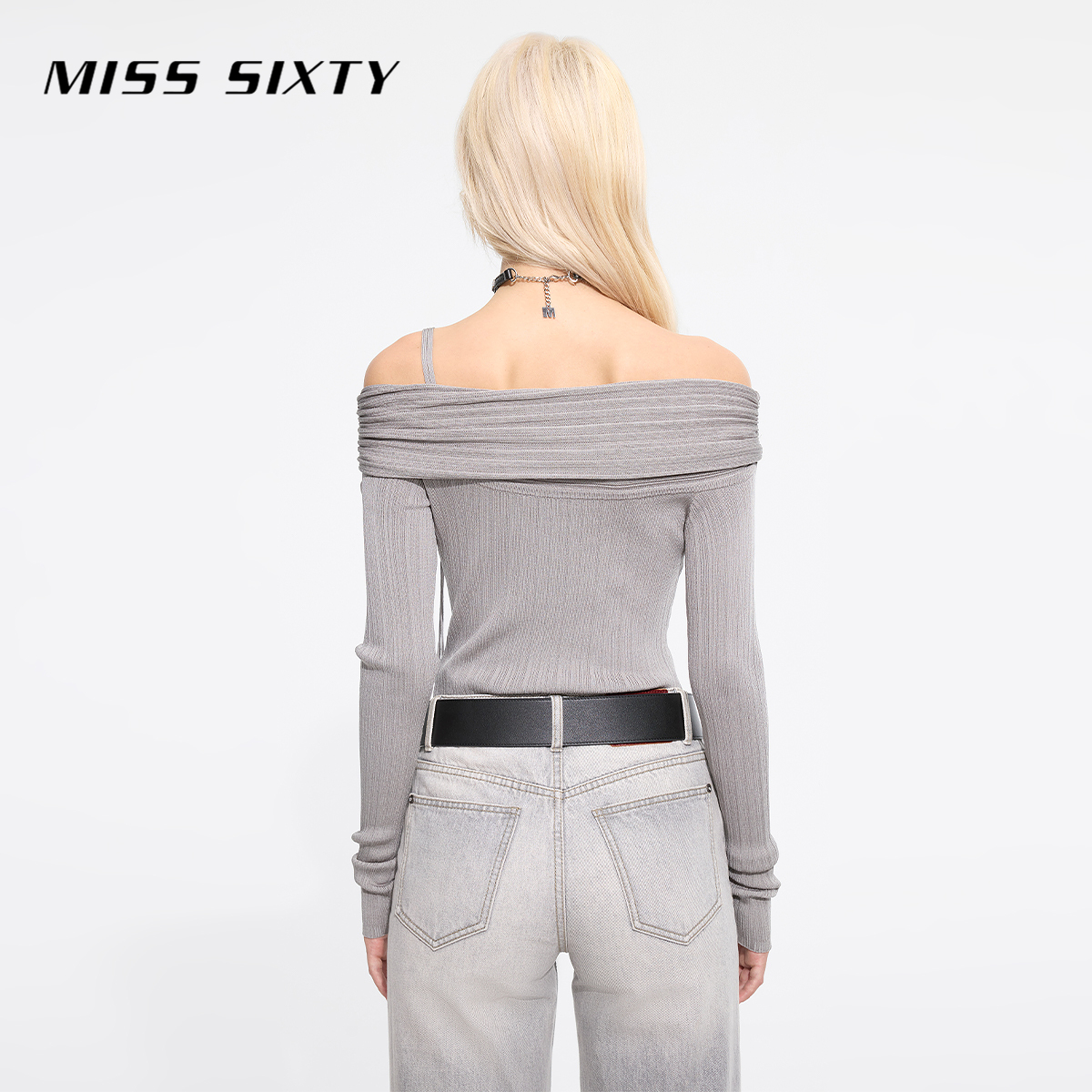 花朵一字领露肩气质优雅上衣 含桑蚕丝针织衫 Miss Sixty25春秋新款