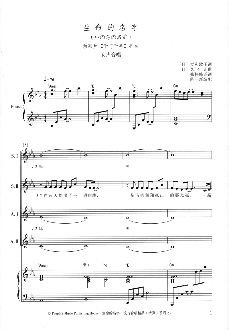 人民音乐出版 声乐曲谱乐谱书籍 附MP3一张 与作品分析 曲式 社 陈一新 流行合唱精品活页系列 女声合唱五线谱与简谱 名字 生命