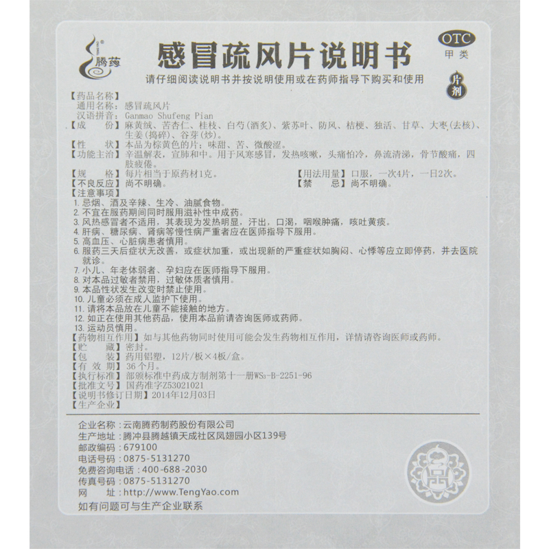 云南腾药感冒疏风片48片风寒感冒药发烧咳嗽流清鼻涕怕冷