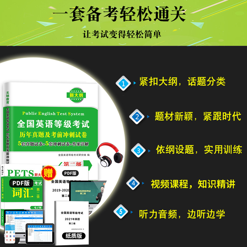 天明正版 考前冲刺试卷PETS2全国英语等级考试历年真题及考前冲刺试卷第二级公共英语二级 2022年全国英语等级考试二级历年真题试卷