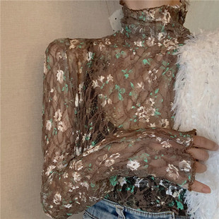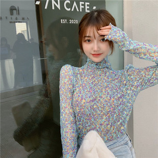 高领内搭新款 碎花百搭打底衫 修身 长袖 2023年t恤ins潮 上衣女秋冬季